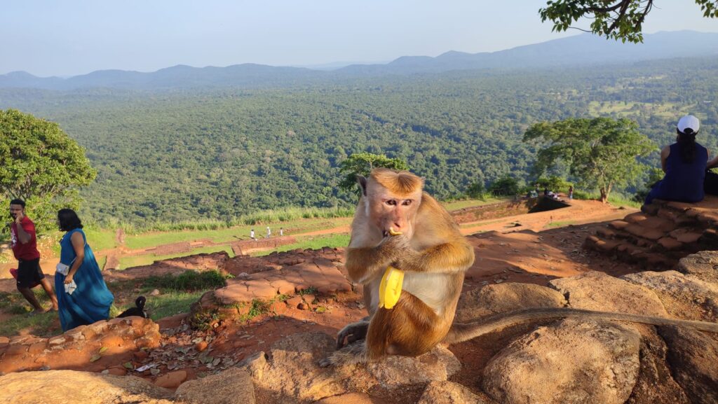 Wer hätte es gedacht, der Lions Rock erwies sich als erstes großes Ziel unserer Reise. Über tausend teils windige Stufen führen hinauf auf einen gewaltigen Felsblock, der pompös aus dem ansonsten flachen Land aufragt. Früher befand sich hier ein Tempel, heute geiern nur einen Haufen Affen auf alles Essbare und ergänzen das herrliche Fotopanorama. An mehreren Stellen des Parks um den Felsen herum finden sich noch Felsmalereien oder präzise gehauene Felsblöcke und es lassen sich noch ein paar der alten Räumlichkeiten erahnen; das Spektakel allerdings bleibt die einmalige Aussicht über das Land und der schwindelerregende Auf- und Abstieg. Wobei zweiteres nicht zuletzt dadurch in Erinnerung blieb, da gegen Abend so viele Menschen wieder herabsteigen wollten, dass man über eine halbe Stunde in der Schlange stand, wo sich immer wieder Menschen vordrängten oder sich über kleine Seitengänge vorne in die Menschentraube integrierten.
