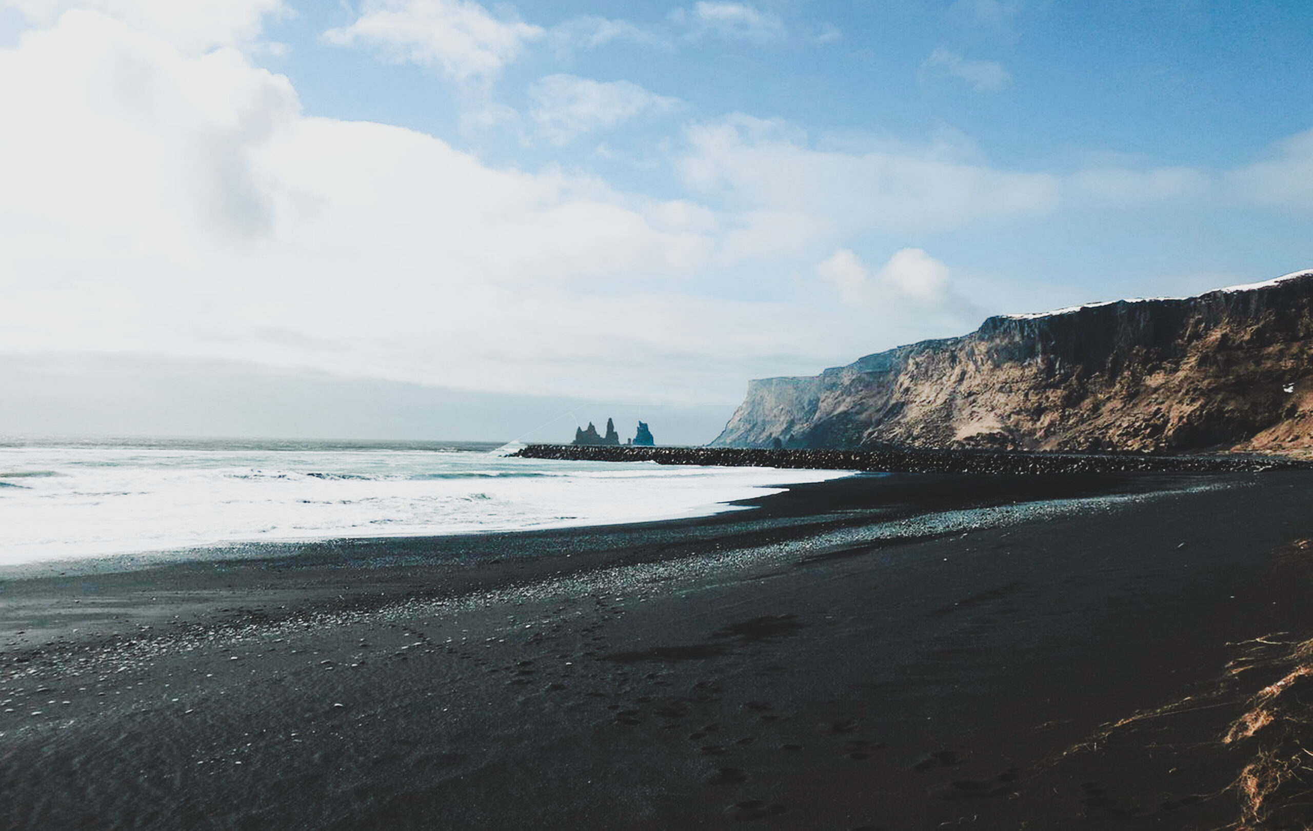 Ein Strand der ganz anderen Art: schwarzer Lavasand, raue See, mystische Basaltsäulen. Spektakulär – besonders bei Sonnenuntergang.