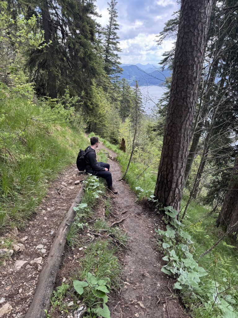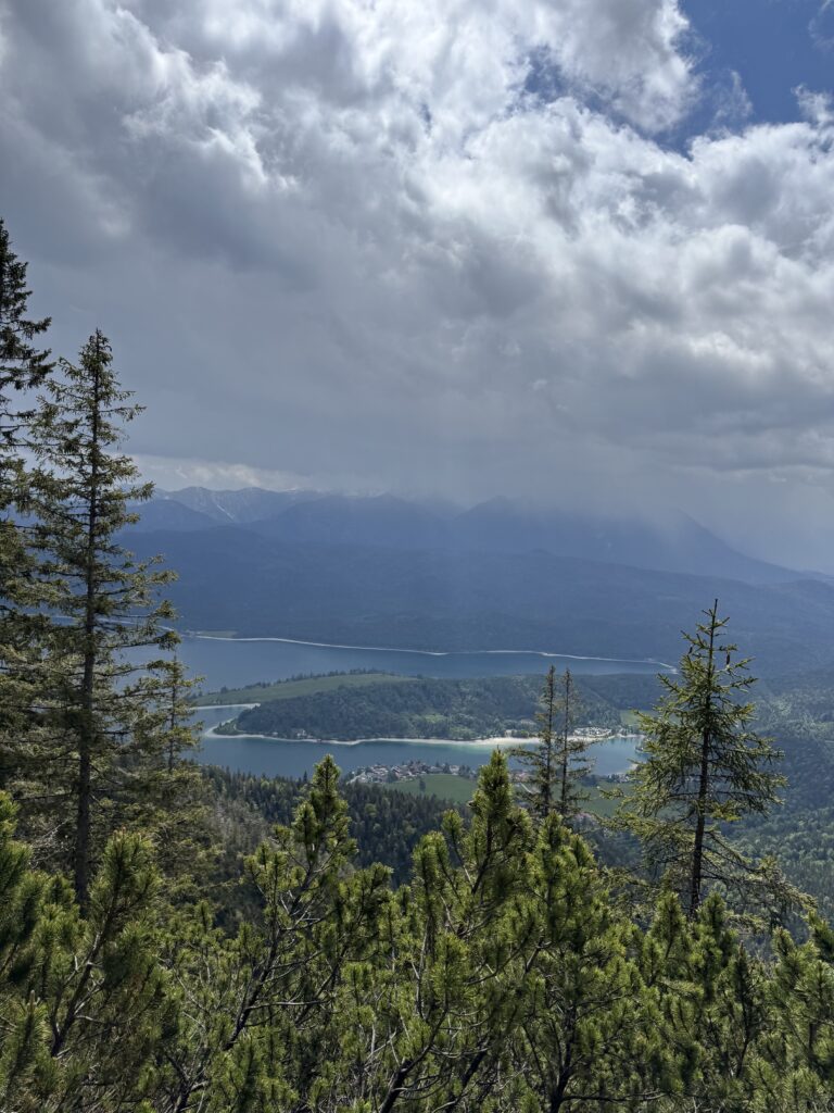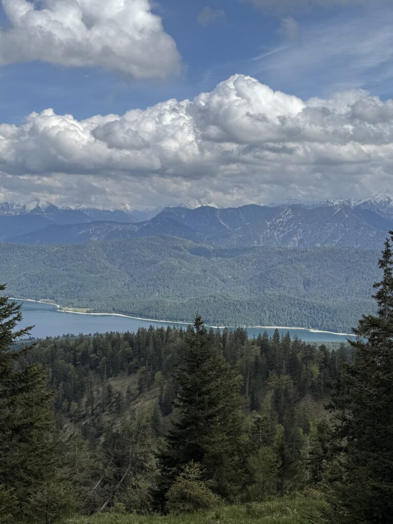 Der Aufstieg beginnt relativ steil, verläuft aber auf gut ausgebauten Wegen. Wer ein bisschen Grundkondition mitbringt, wird keine Probleme haben. Bereits nach wenigen Minuten öffnen sich erste Ausblicke auf den glitzernden Walchensee. Je weiter wir steigen, desto beeindruckender wird das Panorama: Schneebedeckte Berggipfel ragen in der Ferne auf, der See liegt tiefblau eingebettet im Tal, und die Wälder färben sich in frischem Frühlingsgrün.