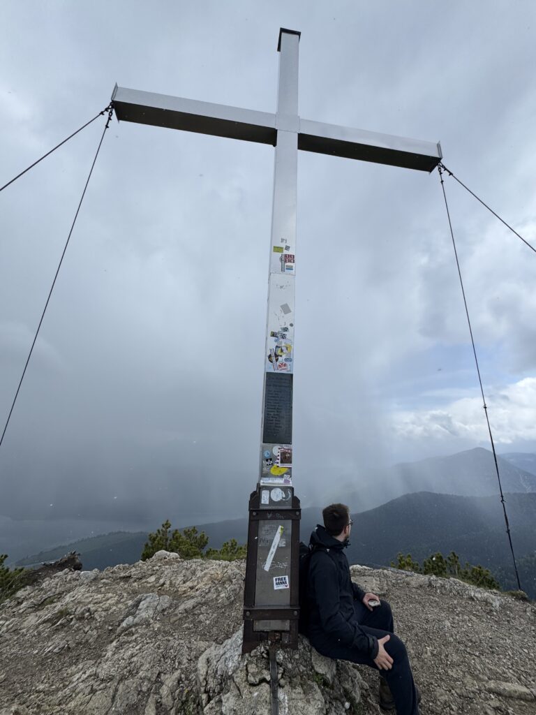 Als wir schließlich das erste Gipfelkreuz erreichten, spürten wir sofort, dass dies ein besonderer Moment war – auch wenn es sich irgendwie wie der Anfang unserer eigentlichen Tour anfühlte. Von dort oben eröffnete sich uns erstmals der Blick auf den Kochelsee, der in der Ferne ruhig und glitzernd lag. Dieser zusätzliche Ausblick machte das Erlebnis noch eindrucksvoller und zeigte uns einmal mehr die Vielfalt der Landschaft rund um den Herzogstand.