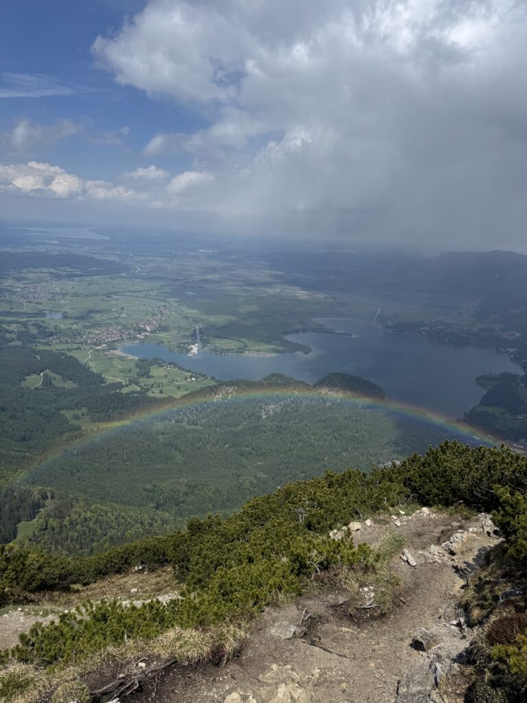 Vom Herzogstandgipfel aus ging es zunächst wieder ein Stück hinab, bevor der Anstieg zum nächsten Gipfelkreuz bevorstand – dem Martinskopf, der auf dem Weg zum Heimgarten liegt. Dort angekommen, eröffnete sich uns ein ganz besonderes Schauspiel: Über dem Kochelsee spannte sich ein Regenbogen, der sich eindrucksvoll in der Landschaft abzeichnete und die ohnehin schon beeindruckende Aussicht noch einmal veredelte.